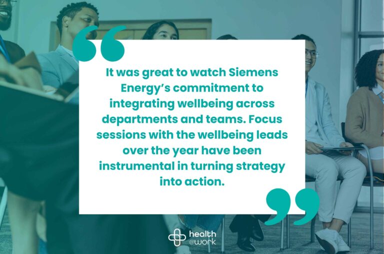 Health and wellbeing are top priorities for Siemens Energy. In 2020, the Head of the Wellbeing Committee wanted to attain external recognition for their initiatives and discovered Health@Work’s Workplace Wellbeing Charter.